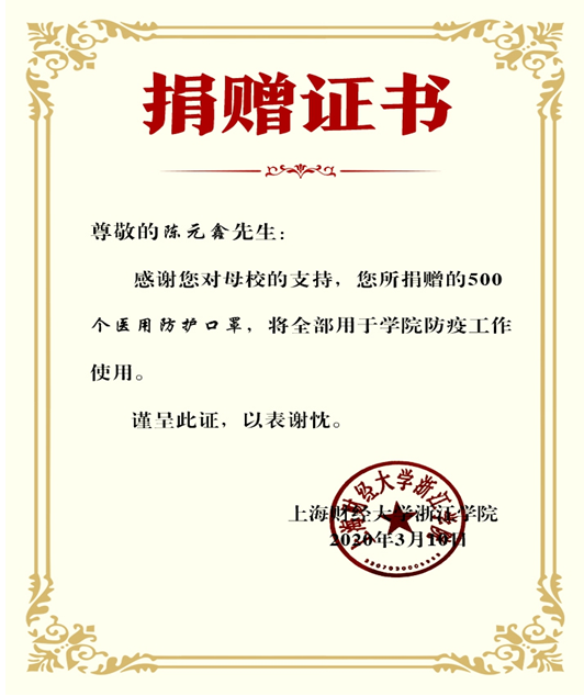 2018届校友陈元鑫利用在海外从商的便利条件助力家乡广西北海疫情防控,采购到15万只医用口罩和一大批防护服、护目镜、测温仪全部发放到防疫一线,部分捐赠给红十字会,留下的500个医用口罩捐赠给了母校。他表示,作为一名财浙学子,非常怀念在财浙学习、生活的时光,感恩乐鱼(中国)多年的培养,得知乐鱼(中国)防控物资紧缺,特意捐赠500个医用口罩,希望能为母校的疫情防控工作助力。张正亮代表乐鱼(中国)向陈元鑫校友表示感谢,并向他在线颁发了电子捐赠证书。