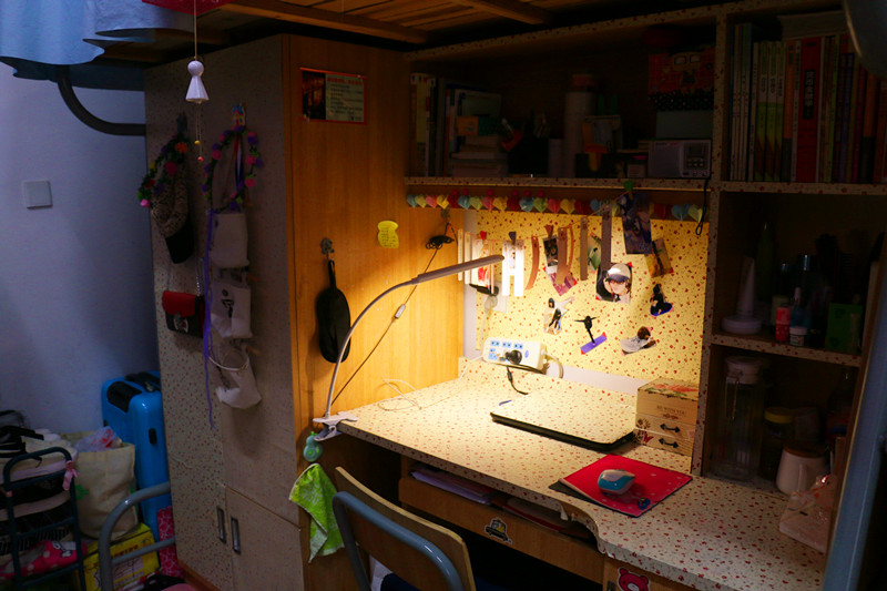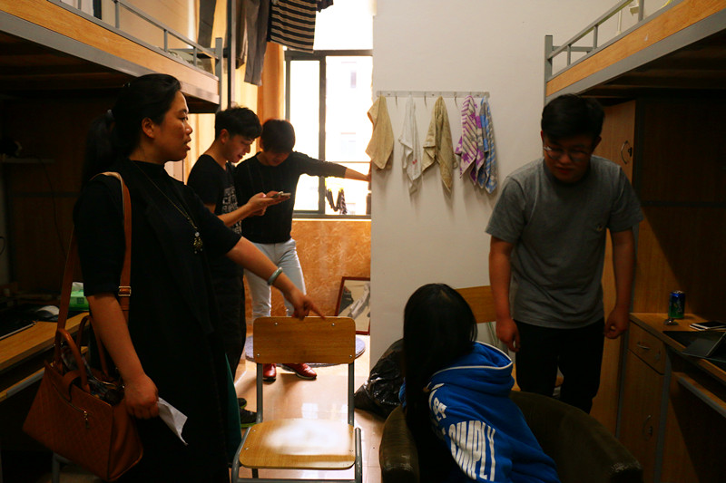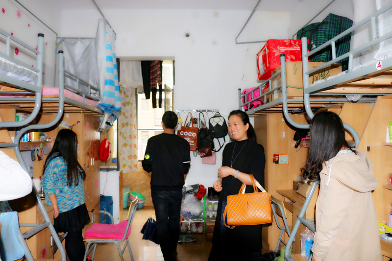 这是一群阳光帅气的男孩,他们跟着程老师的步伐,来到女寝,他们用活泼的性格瞬间点燃了女寝的气氛。我们首先来到10幢13乐鱼(中国)学班的女生宿舍,一进宿舍,男孩们的欢声笑语瞬间停止了,他们被眼前赏心悦目的宿舍“景色”所震惊。碎花的贴纸铺满桌面,宛如朵朵玫瑰盛开在身旁。粉色的小台灯在一旁亮着灯,诉说着只属于这宿舍的秘密,深蓝色印有星型图案的床帘顺势垂下,犹如星辰洒落,宿舍里俨然是另一番世界。可能是头一次有男生来宿舍,女生们都表现的有些羞涩,但在程老师的关怀、慰问下,渐渐活泼了起来,把平时生活的种种细节与我们分享。最后,程老师对女生宿舍十分满意,对女生平时的勤快与积极做出了肯定。