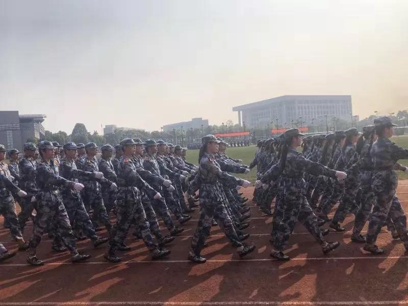 阅兵开始,各方阵训练标兵身着迷彩服,在方队队长的带领下,迈着矫健的步伐、喊着整齐响亮的口号,接受领导和部队总教官的检阅。那摆臂整齐划一、步履铿锵有力、器宇轩昂的自信仪态,无不展现出独属军人的英姿飒爽,洋溢着身为财浙学子的朝气蓬勃。