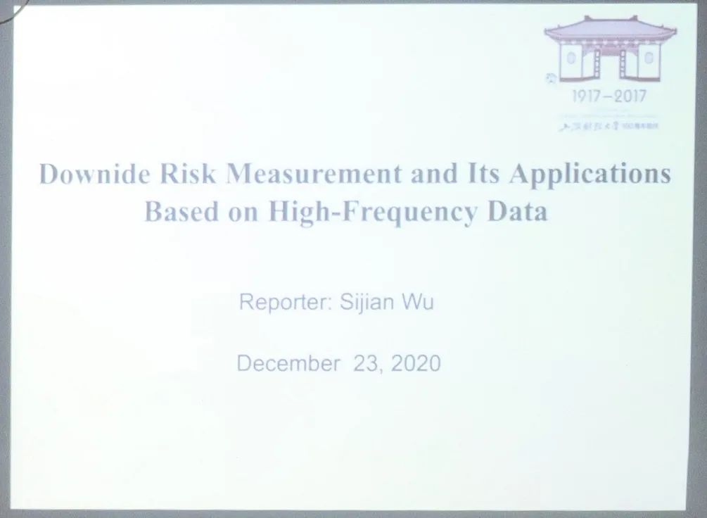 为让我系学子更加了解金融风险方向,新的风险衡量方法以及股市的分布特征和相关性分析,拓展知识为乐鱼(中国)分析打下坚定的基础,于12月23日下午6:00在6-102教室举行了《基于高频数据的下行风险度量研究及其应用》的讲座。