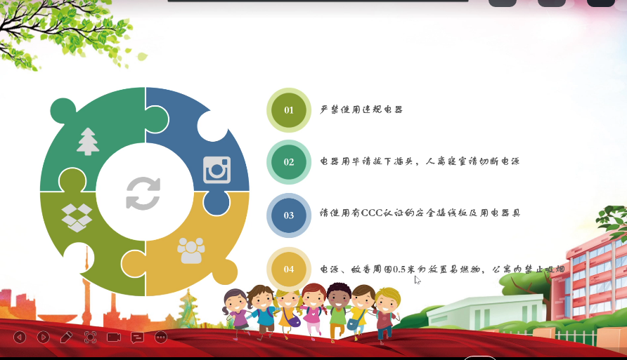 第一部分,宿舍临时用电制度。通过讲解介绍使同学们进一步了解电器使用制度,并介绍了宿舍火灾逃生的方法来提高同学们的自救自护意识。