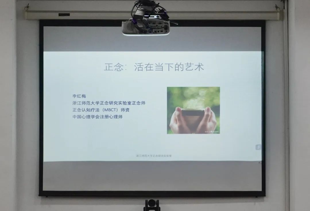 李红梅首先带领同学们通过铃声起始声音来放松身心、调节状态,通过引导让同学们对“正念”有了初步体验。