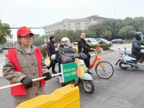 此次志愿活动中,四位志愿者穿戴统一的红色志愿服务衣帽,分守在四个方向路口,手执印有“礼让斑马线,文明过马路”字样的指挥牌,引导市民有序文明过马路,及时对闯红灯、违反交通规则的行人加以规劝,并对非机动车和行人的越线停靠、逆向行驶、不文明穿行马路等行为进行监督、劝阻,用实际行动弘扬志愿服务理念,让广大市民了解文明城市内涵,创造安全、畅通的道路交通环境。