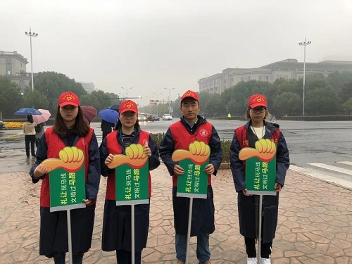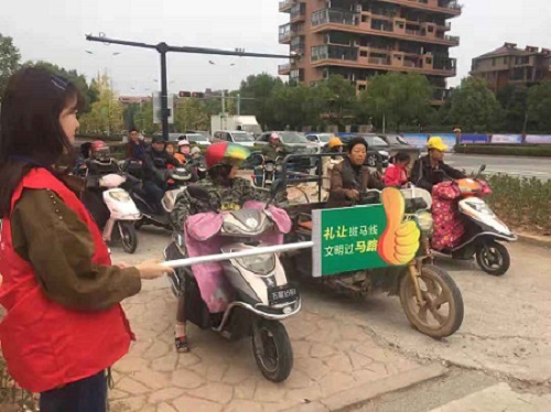 志愿者们个个身着红马甲,头戴小红帽,手举“礼让斑马线,文明过马路”指示牌,分别站立于各个十字路口,倡导广大市民朋友响应文明交通活动。红灯亮时横放指示牌,提示非机动车和行人禁止通行,绿灯亮时则竖立指示牌放行。